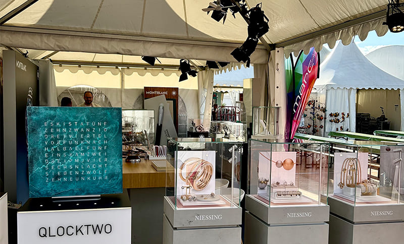 Am Stand von Juwelier Marc sind das aktuelle Schmuckstücke der Vredener Manufaktur Niessing, außergewöhnliche Zeitmesser der Marke Qlocktwo und erstmals auch Uhren und edle Accessoires von Montblanc. Man freue sich sehr, die zeitlos schönen Produkte während des Zeltfestivals gemeinsam mit Carsten Meyer, dem Montblanc Sales Manager Northern Europe, einem größeren Publikum vorstellen zu können, sagt Béla Krischel von Juwelier Marc. Neben direkten Verkäufen vor Ort gehörten in den vergangenen Jahren auch eine gesteigerte Bekanntheit sowohl des Juweliers als auch der präsentierten Brands zum erfolgreichen Ergebnis der gemeinsamen Zeltfestival-Auftritte. Begeistert über die Möglichkeit, Montblanc in dem für die Marke ebenso außergewöhnlichen wie kulturell hochwertigen Umfeld präsentieren zu können, ist auch Carsten Meyer. Er hofft, während des Zeltfestivals ganz neue Interessenten und Kunden für die beliebten Uhren, Schreibgeräte und Accessoires gewinnen zu können.