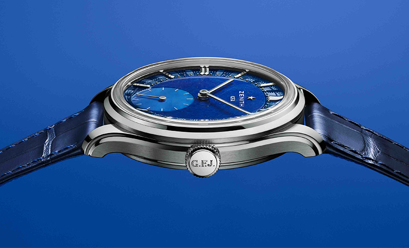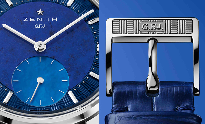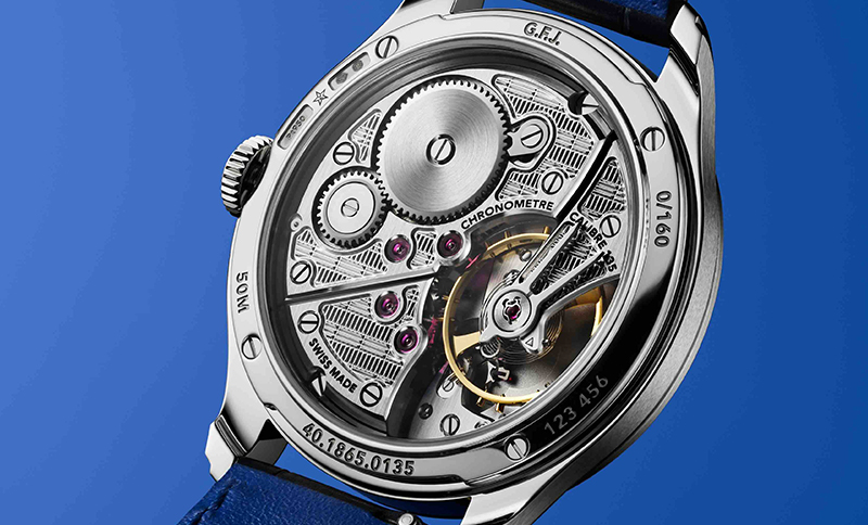 Das Kaliber ist als Chronometer zertifiziert und in einem Gehäuse aus Platin verbaut, das genau 39,15 Millimeter im Durchmesser misst. Die Jubiläums-„G.F.J“ bietet ein Zifferblatt aus blauem Lapislazuli und verfügt über Zeiger und Indizes aus Weißgold. Bei 6 Uhr befindet sich die kleine Sekunde.