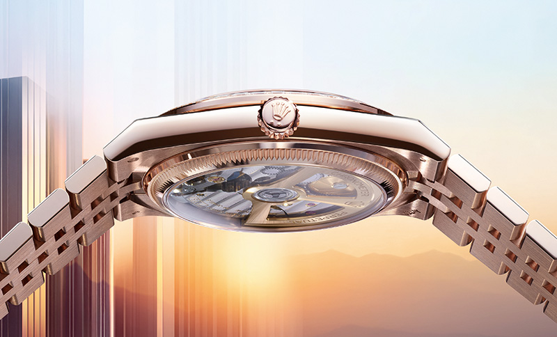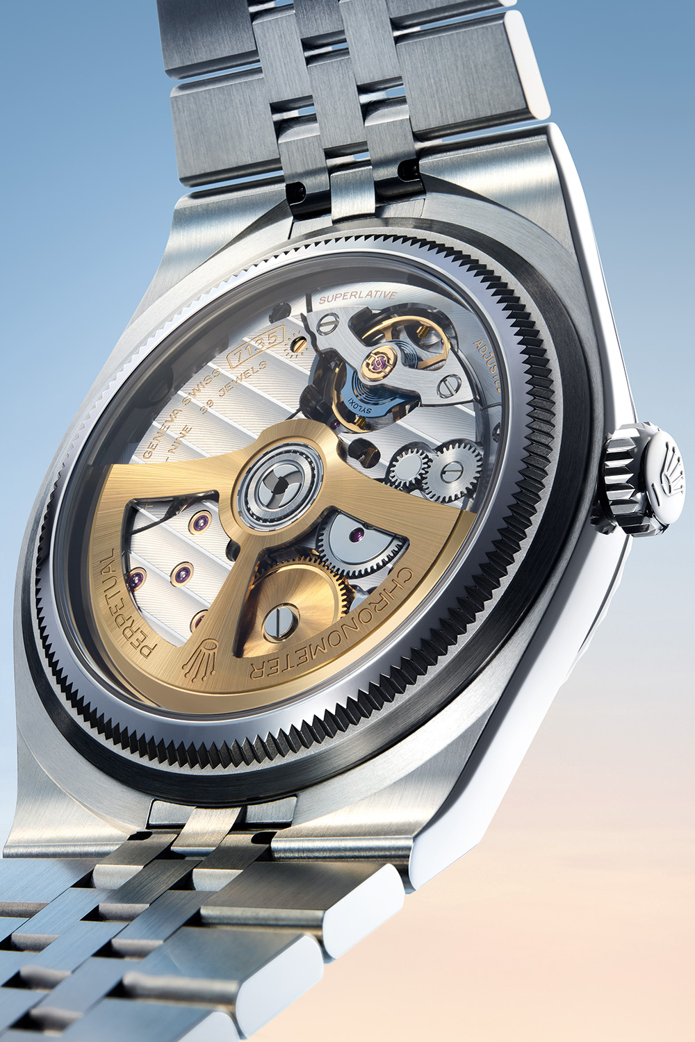 Erstmals verwendet Rolex bei der „Land-Dweller“ einen transparenten Gehäuseboden, durch den das aufwendig dekorierte Uhrwerk sichtbar ist. Die Schwungmasse aus Gelbgold sowie die auf den Brücken angebrachten Rolex Côtes de Genève-Verzierungen sind damit direkt einsehbar. Dieses Designelement ist bei Rolex eine Seltenheit und hebt die „Land-Dweller“ von anderen Modellen der Marke ab.