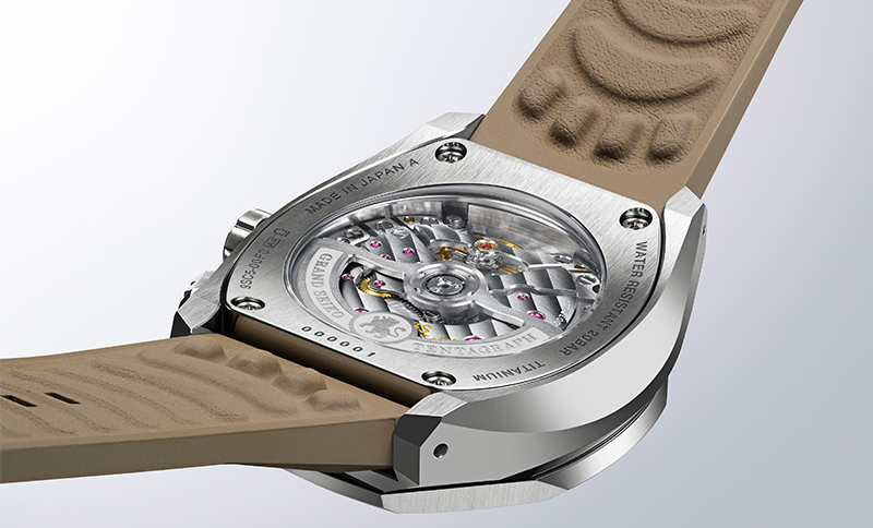 Die in den über 60 Jahren gewonnene Manufaktur-Expertise spiegelt sich auch im Uhrwerk wider: In der Neuheit ist das 2023 lancierte Kaliber 9SA5 mit Beinamen „Tentagraph“ verbaut. Dank fünf Hertz Unruhfrequenz stoppt das Automatikwerk mit innovativer Doppelimpulshemmung auf die Zehntelsekunde genau. Das vorderseitig montierte Stoppmodul verfügt selbstverständlich über klassische Schaltradsteuerung. Zwei Totalisatoren reichen bis 30 Minuten und 12 Stunden.