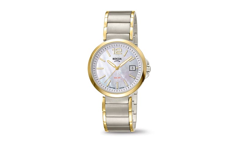 Oben: Zeitlos – von der Sonne angetrieben: die neue Solardamenuhr von Boccia Titanium (Reintitan, teilgoldplattiert, Saphirglas, Perlmuttzifferblatt, Datum, bis 5 bar wasserdicht, Reintitanband).