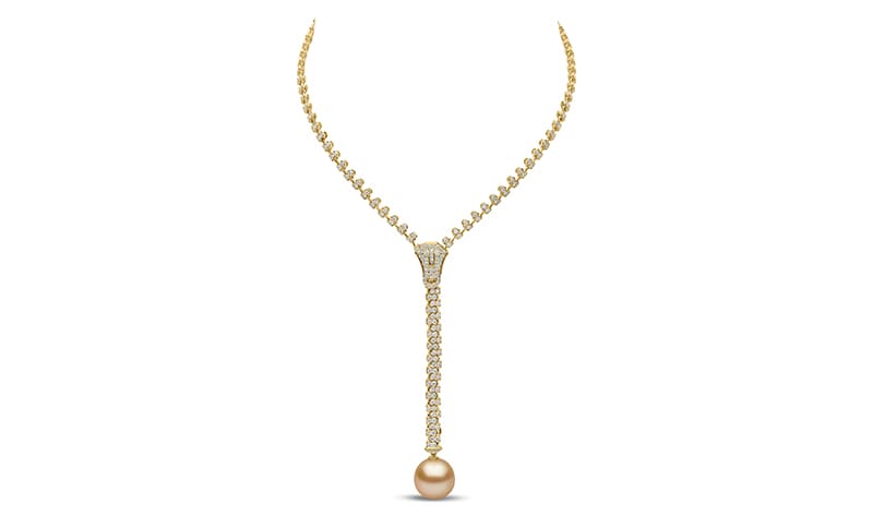 Collier „Zyyp“ mit markantem Reißverschlussmechanismus sowie Südseezuchtperle und Diamanten, in 750 Gelbgold.