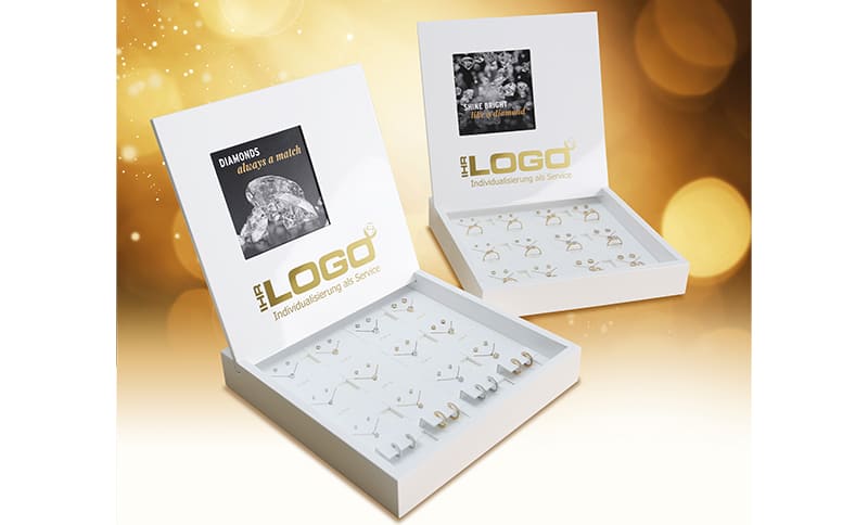 Die hochwertigen Boxen aus edlem Klavierlack minimieren den Investitionsaufwand für Juweliere, steigern aber zugleich die Verkaufschancen, und mit individuellem Händlerbranding als Private Label wird der Fachhändler zur Marke. Zusätzlich wird durch die Möglichkeit, die Muster direkt vor Ort zu zeigen, die Kaufentscheidung erleichtert.