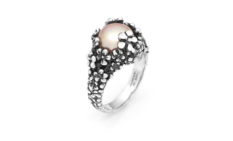 Die aufwendige Wachsausschmelztechnik verleiht dem Schmuckstück aus der hauseigenen italienischen Manufaktur seinen markanten und einprägsamen Look: Eine imposante rosafarbene Süßwasserperle wird von filigranen, diamantierten Blüten aus oxidiertem Silber umrahmt, die ihr faszinierendes Leuchten noch verstärken. Jedes Detail ist ein Meisterwerk italienischer Handwerkskunst.