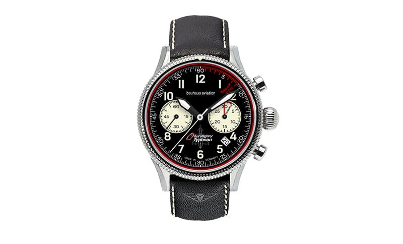 Eines der neuen Messehighlights von Pointtec ist die neue „Eurofighter“- Linie, die mittlerweile in der fünften Generation erscheint und über die offizielle Lizenz verfügt. Die Leistungsparameter des Eurofighter-Jets sind auf der Chronographen-Skalierung farbig markiert. Im Inneren schlägt das Chronographen-Werk SW510 von Sellita.