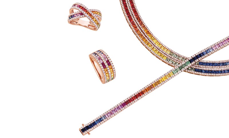 Die Rainbow-Kollektion mit Saphiren im Farbverlauf – ein Beleg für die Vielfalt des Angebots der Diamond Group.