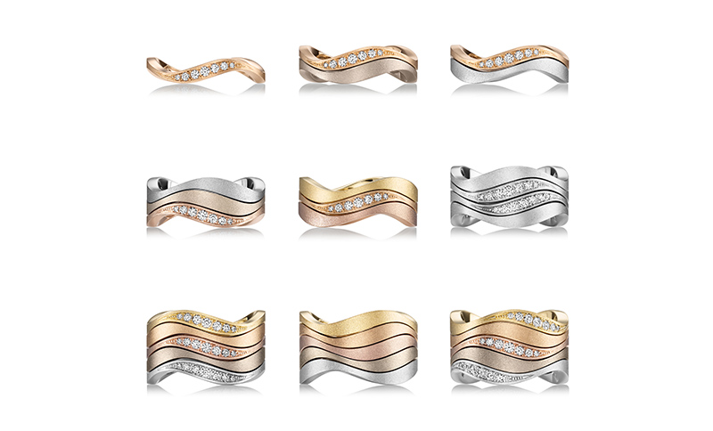 Insbesondere die Kollektion „Wellen“ dürfte eins der Highlights in München sein. In Anlehnung an Ebbe und Flut ist eine ausdrucksstarke Schmuckringserie entstanden: Zwei Ringformen, eine auf- und eine absteigende Welle, die sich perfekt ergänzen und beliebig kombiniert werden können. „Die Welle begleitet uns als Symbol des Lebens: ein stetes Kommen und Gehen, ein beständiges Auf und Ab“, sagt die Designerin Annelie Waldhier-Fröhling, die ihr Schmucklabel vor zweieinhalb Jahren aus der Taufe gehoben hat.