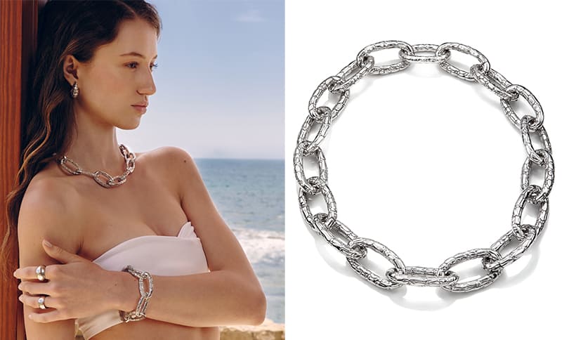 In den skulpturalen Oberflächen der „Kroko“-Halskette und des Armbands scheint das Silber beinahe zum Leben zu erwachen, wenn sich die Kraft der Natur mit der Handwerkskunst der Manufaktur vereint.