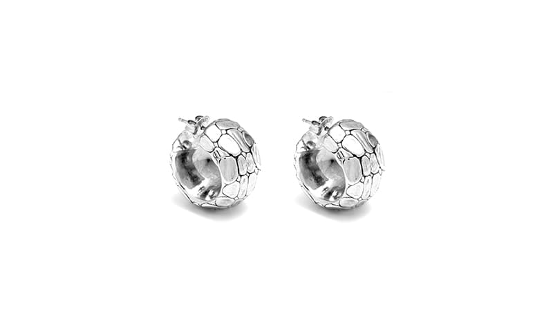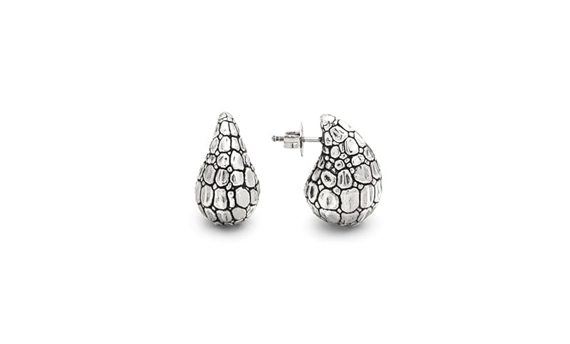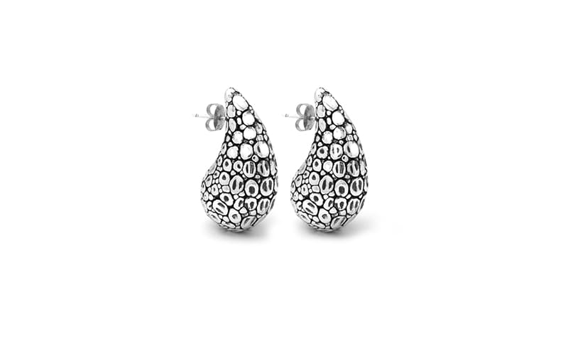 Vervollständigt wird das Arrangement mit den Ohrringen „Tropfen Kroko“, die ihrer Trägerin einen ausdrucksstarken und zugleich femininen Look verleihen. Die Schmuckstücke aus 925er Silber werden durch galvanische Elektroformierung hergestellt, eine Technik, die auch großen Kreationen eine filigrane Leichtigkeit verschaffen kann. Diese wunderbaren Schmuckstücke fangen die Essenz des Sommers ein und übertragen sie auf die Trägerin: Sonnenstrahlen auf der Haut, das Rauschen des Meeres in der Ferne oder eine Villa mit Blick auf eine mediterrane Küste.