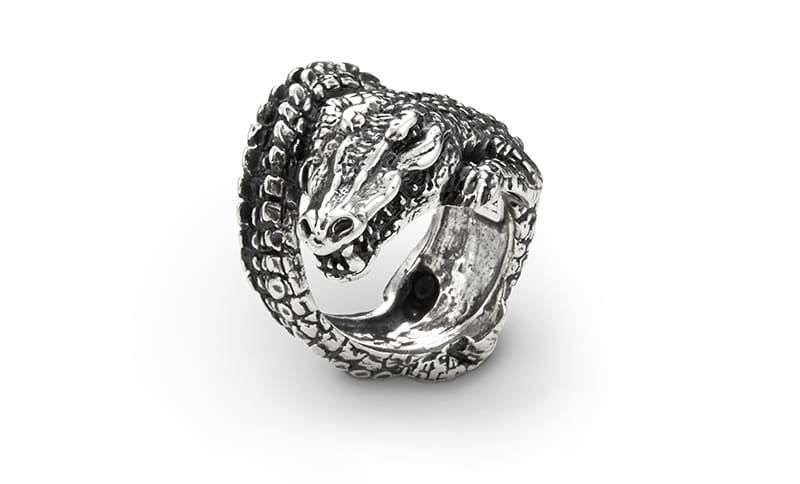 Das silberne Krokodil von Giovanni Raspini legt sich plastisch um den Finger.