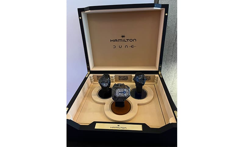 Hamilton versteht sich als „The Watchmaker of Filmmakers“ und hat dies mit vielen (Uhren-) Auftritten in der Vergangenheit untermauert. Beim Event, bei dem die GZ-Redaktion exklusiv für Sie zugegen war, waren daher auch zahlreiche Uhren ausgestellt, die zuletzt auf der großen Leinwand zu sehen waren, wie beispielsweise die „Ventura“ aus „Dune: Part Two“ (die GZ berichtete) oder die Vintage-Uhr aus Oppenheimer (die GZ berichtete ebenfalls). Das Besondere ist nach wie vor, dass Hamilton dafür weder Geld erhält noch zahlt: Vielmehr sind die eigens für Filme konzipierten und hergestellten Uhren eine Art „Service“ für Hollywood & Co., der einerseits die Designer und Uhrmacher von Hamilton vor neue Herausforderungen stellt und zu neuen (kreativen) Höchstleistungen antreibt, andererseits den Filmen für das jeweilige Setting passende respektive historisch akkurate Zeitmesser beschert. Und Hamilton profitiert von der Werbewirkung der Filme.