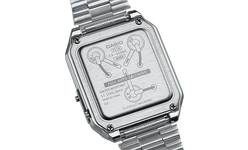 Die Verbindung zum Film liegt in der Uhr, die Protagonist Marty McFly seinerzeit am Handgelenk trug: die Taschenrechneruhr CA-500. Jenes Modell interpretiert Casio zum runden Jubiläum des Sci-Fi-Films nun mit futuristischem Charme und orientiert sich in der Gestaltung am Auto aus der Serie: dem DeLorean DMC-12. Die Neuinterpretation der Uhr trägt den Namen CA-500WEBF-1AER.