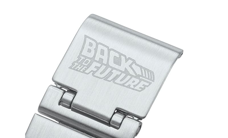 Die Farbgebung rund um die Tasten erinnert an die Zeitschaltkreise der filmischen Zeitmaschine, das silberfarbene Resingehäuse und das Edelstahlarmband spiegeln die Ästhetik des DeLorean wider. Auf dem Gehäuseboden ist ein stilisierter Fluxkompensator eingraviert – jenes fiktive Bauteil, das Zeitreisen überhaupt erst möglich macht. Weitere Details sind das „Back to the Future“-Logo auf der Schließe oder die Sonderverpackung im VHS-Stil.