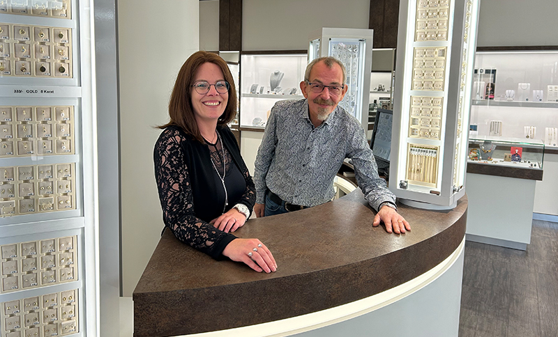 Ihr neuestes Projekt, nachdem auch die 14-Karat-Gold-Drehvitrine von Koch funktioniert hat, ist die eigene Diamantkollektion von Lieferant Skowronek. Für Stephan Koch ist es schlicht die Aufgabe des Lieferanten, dafür zu sorgen, dass der Kunde ein funktionierendes Sortiment führt. Was sind die sechs besten Herzen für diesen Standort? Er weiß es nach einem Blick in seine Gesamtzahlen. Melanie Wittig schätzt beim Koch-Konzept die Freiheit, Sortimente zu vergrößern oder zu verkleinern oder Produktgruppen auszuprobieren – was bei herkömmlichen Marken nicht so problemlos umsetzbar ist. Am Ende einer guten Kundenbeziehung, sagt Melanie Wittig, gehe es um Vertrauen. „Kann ich hinter einer Firma stehen?“ Diese scheinbar einfache Frage kann sie seit einem Jahr besonders gut beantworten. Einbrecher hatten annähernd das komplette Geschäft leergeräumt. Die Versicherung sei entgegenkommend gewesen, einige Lieferanten in ihren Forderungen bei einem möglichen Neustart eher nicht.