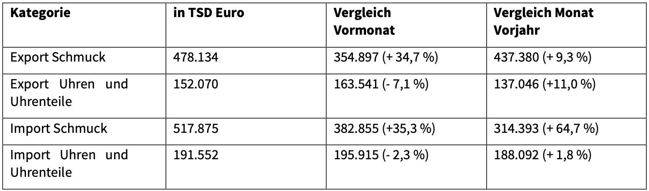 So sind beispielsweise die Exportzahlen von Schmuck um 9,3 Prozent und jene von Uhren respektive Uhrenteilen um 11 Prozent im Vergleich zum Vorjahr gestiegen. Auch das Importvolumen ist teils stark (ein Plus von 64,7 Prozent bei Schmuck) und teils dezent (Plus von 1,8 Prozent bei Uhren und Uhrenteilen) gewachsen.