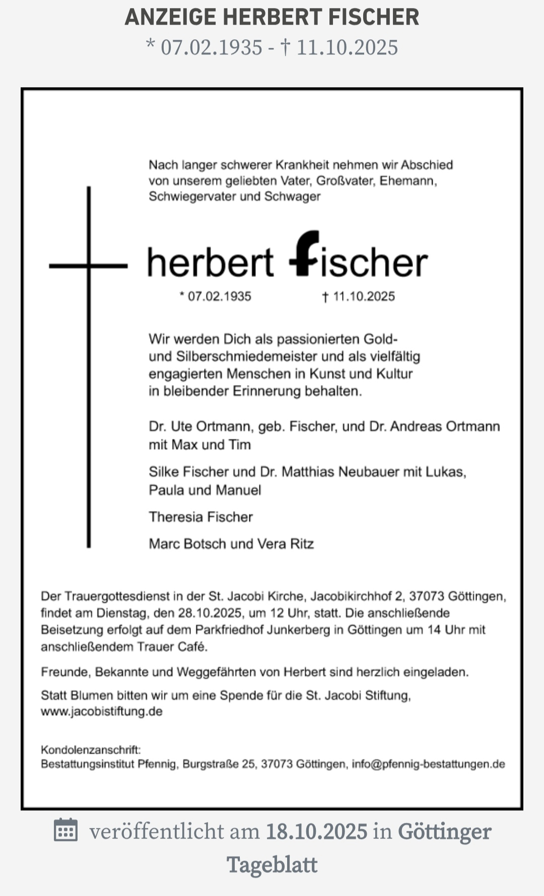 Ehemalige Weggefährten sind eingeladen, an der Trauerfeier teilzunehmen: Der Trauergottesdienst findet am Dienstag, dem 28. Oktober 2025, um 12 Uhr in der St. Jacobi Kirche in Göttingen statt. Die anschließende Erdbestattung erfolgt um 14 Uhr auf dem Parkfriedhof Junkerberg.