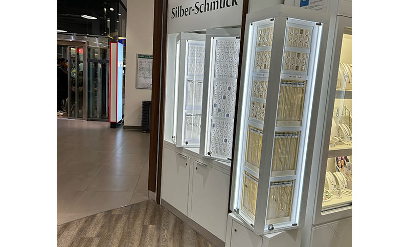 In der Dekoration hängen Dummys, die Originale sind ordentlich aufgereiht in der Drehvitrine zu finden. Auf einen Blick sind vorhandene Legierungen, Längen und Preise sichtbar beziehungsweise einfach nachzuordern. Die Testphase ist angelaufen, erste Verkaufserfolge stimmen positiv. Das Upgrade zu Goldketten gelingt häufiger, als dass der Kunde Dummy-Ketten kaufen will.