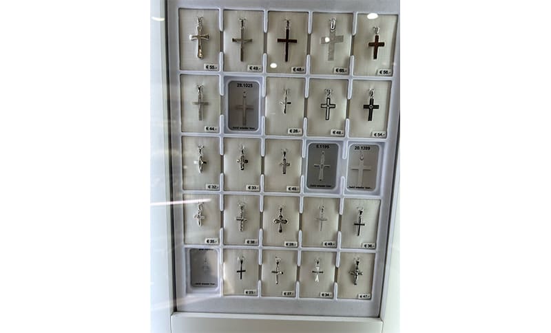 Dieses Ergebnis ist selbst für das 14-köpfige Verkaufspersonal von Juwelier Wirz aus Paderborn überraschend: Rund 80 Prozent der Käufer, die aus der Drehvitrine einen goldenen Anhänger kaufen (8 oder 14 kt), kaufen auch eine Kette – und zwar in der gleichen Legierung. Ergo: Nur selten werden Anhänger pur gekauft, berichtet Chefin Sonja Kemper auf Nachfrage der Goldschmiede Zeitung. Ähnliches berichtet Goldschmied Alfons Spieker. Eine Kundin hatte am Vortag einen goldenen Anhänger (14 kt) als Geschenk gekauft, kam am folgenden Tag noch einmal zurück, um eine passende Kette und auch ihrem anderen Enkelkind diesen Anhänger mit Kette zu kaufen. Verschmerzbarer Haken: Bei den Ketten ist sie aus Budgetgründen auf 8 kt ausgewichen. Es gibt ihn also, den „Doppel-Shopper in Gold“, und somit wäre deutlich widerlegt, dass die ideale Durchschnittsverkaufspreislage bei Drehvitrinen zwischen 69 und 99 Euro, niemals aber im dreistelligen Bereich liegt.