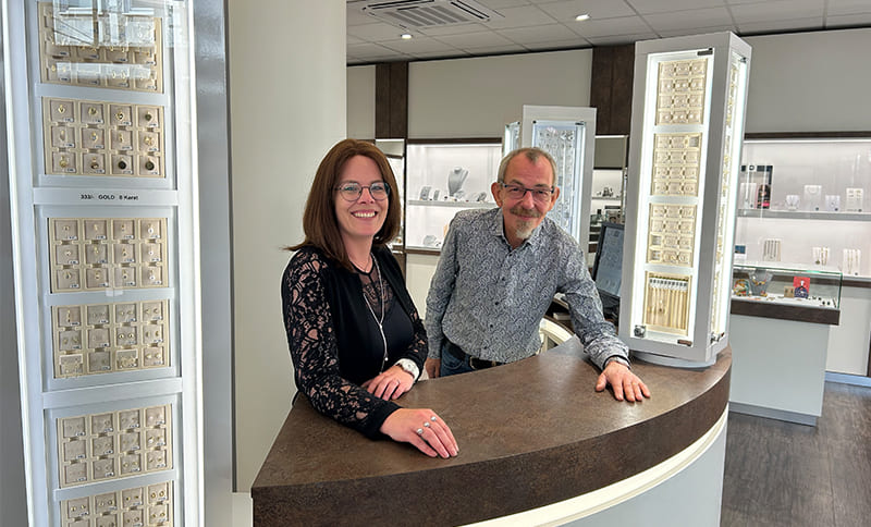 Stephan Koch lobt das Einkaufsverhalten der neuen Chefin Melanie Wittig, gelernte Handelsfachwirtin, als „kritisch, aber mit Wagnis, in einer guten Balance“. Wittig gibt das Lob zurück: „Danke, dass mir dieser Lieferant solche Freiheiten ermöglicht.“ Roségold beispielsweise will sie gar nicht. Auch Gravurplatten oder Medaillons würden sich derzeit bei ihr schwerer tun, was Stephan Koch mit Blick auf die Gesamtzahlen bestätigt. Kein Problem, das Sortiment ist schnell verkleinert oder getauscht.