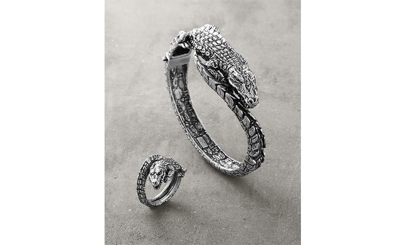 Die Helligkeit des polierten Weißmetalls hebt sich vom brünierten Hintergrund ab und erzeugt einen kontinuierlichen Dialog zwischen hell und dunkel. Der Krokodilring ist eine Stilikone der Marke und ein animalisches Meisterwerk. Er verkörpert perfekt die kreative Spannung, die den Schmuck von Giovanni Raspini ausmacht.