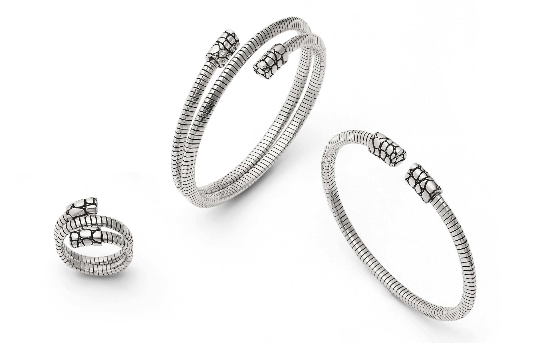 Im Mittelpunkt der kommenden Saison stehen die Kollektionen „Gold Skin“ und „Tubogas Kroko“. Wobei erstere eine besondere Herausforderung darstellt: Aus gegossenem und vergoldetem Silber gefertigt, entwickelt die von der Natur inspirierte Kollektion skulpturale Wirkung. Um Lichteffekte und Eleganz zu betonen, wurden Elemente aus Perlmutt eingefügt, wodurch ein faszinierendes Spiel aus Reflexionen und Opaleszenzen entsteht. „Gold Skin“ umfasst je zwei Halsketten und Ohrringe sowie Anhänger, Armband und Ring.
