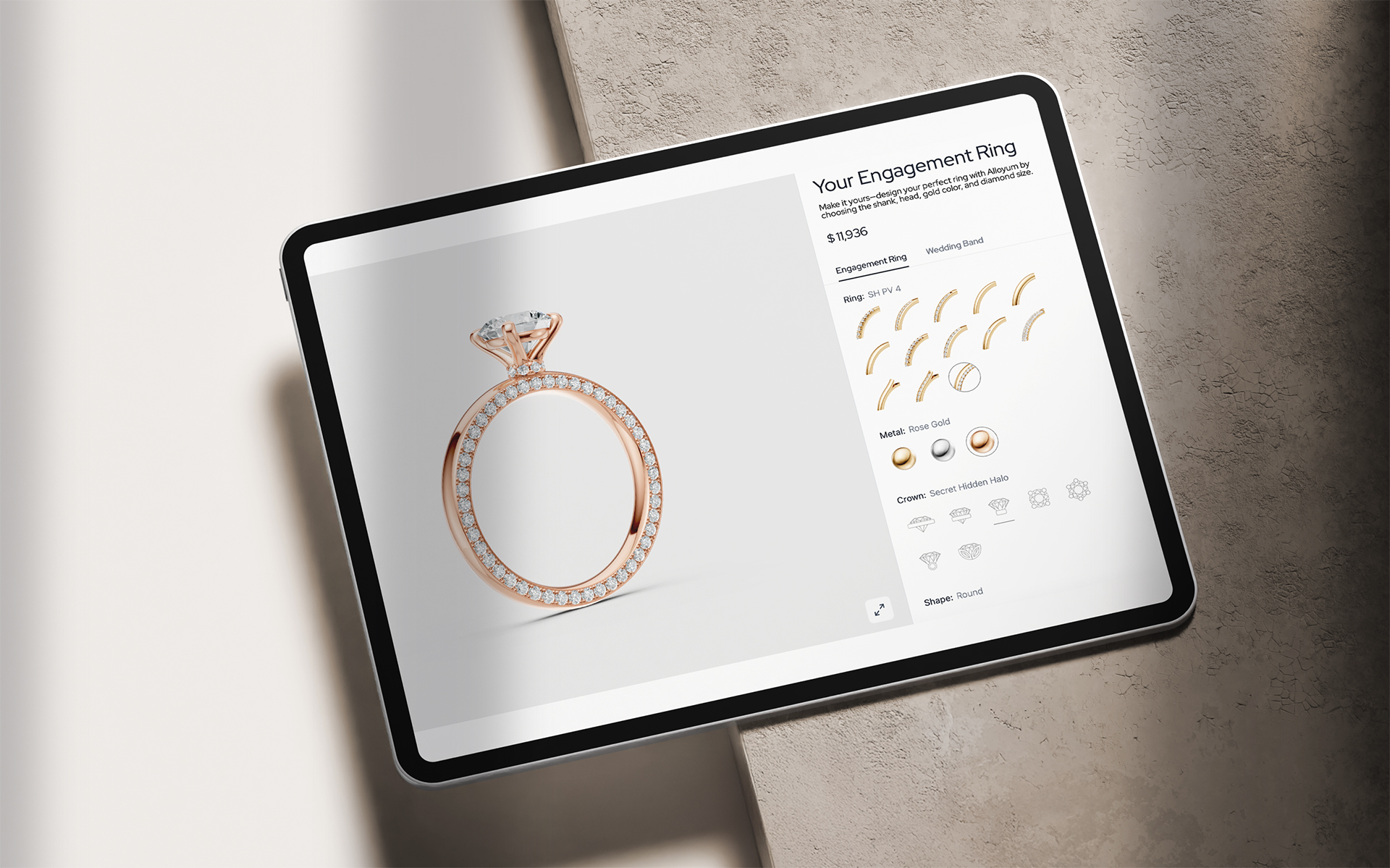 Ihre Antwort ist der Schmuckkonfigurator Alloyum. Wenn ein Kunde statt eines Brillanten doch einen ovalen Diamanten, eine andere Legierung oder Fassart wünscht, können die Varianten live und elegant am Tablet gezeigt werden. Der Kunde sieht sofort, was möglich ist – und das Beratungsgespräch bleibt im Flow.