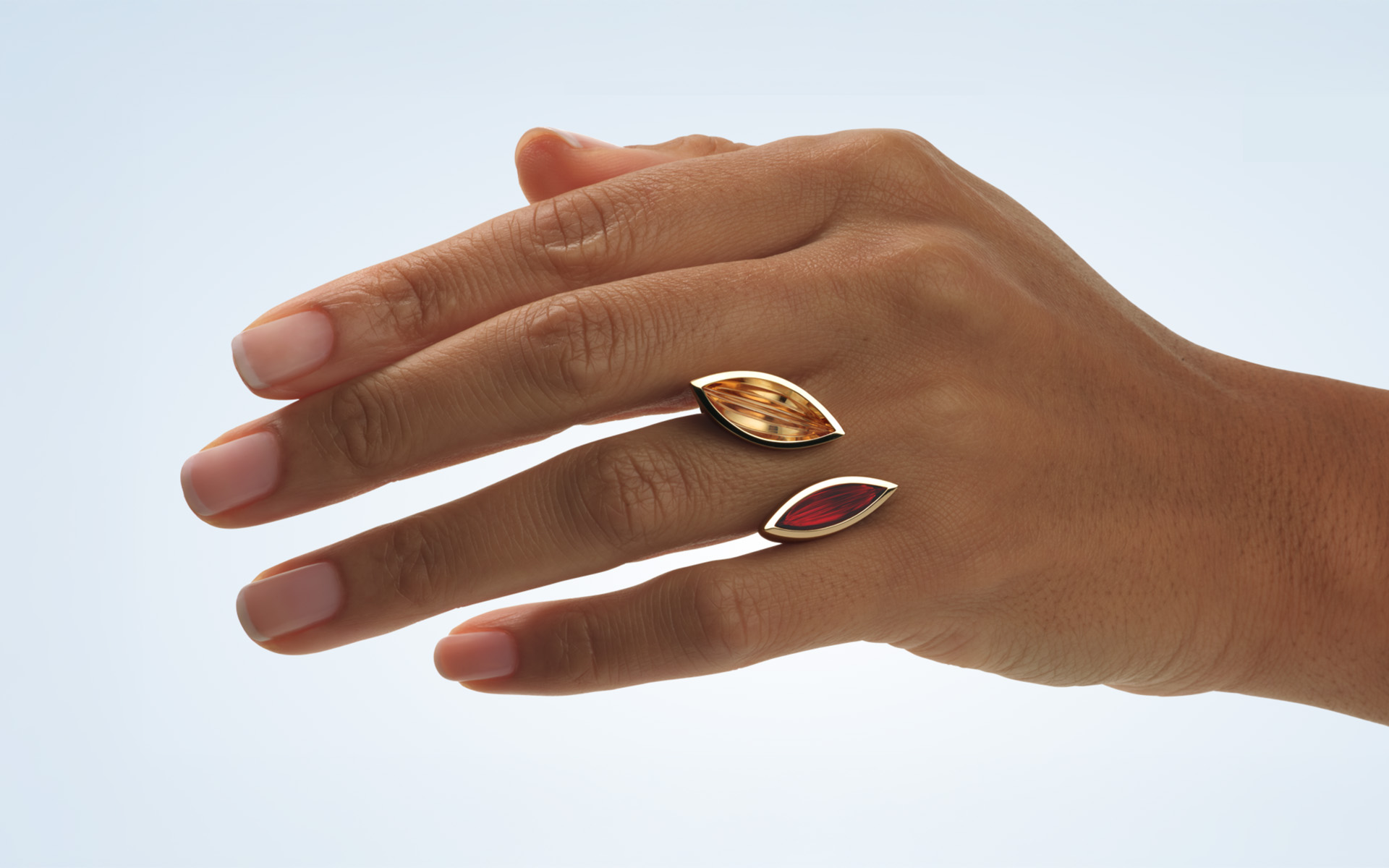Ringe wie Skulpturen – mit unerschöpflicher Kreativität entwickelt Angela Hübel immer wieder neue, aufregende Objekte mit Edelsteinen, Gold, Platin und Perlen. Die Designs sind formal reduziert und doch überraschend vielgestaltig und ausdrucksstark. Ein Beispiel ist „Regatta“ mit Citrin und Amethyst.