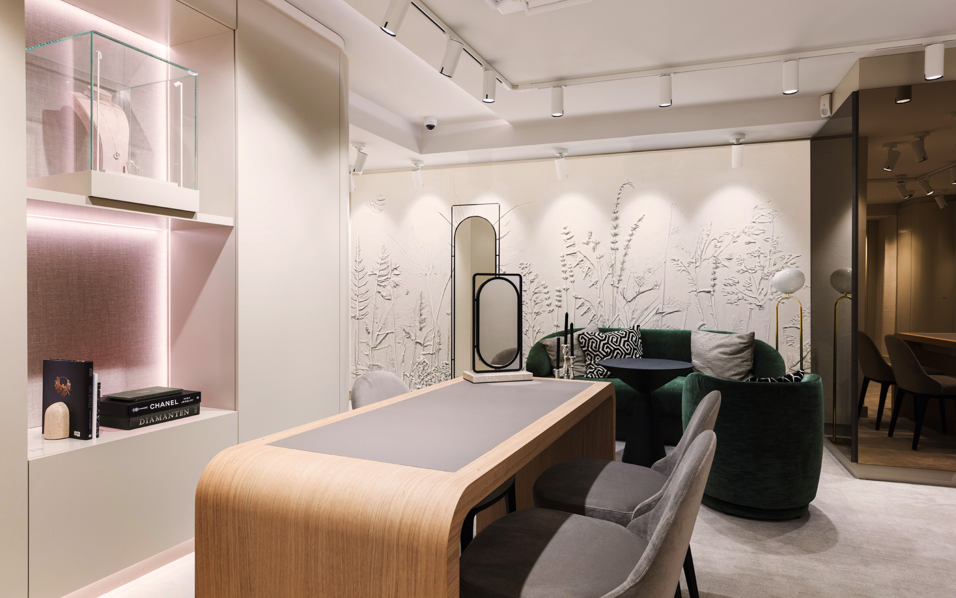Licht ist eines der wichtigsten Elemente überhaupt. Mit schlechtem Licht kann man die beste Architektur ruinieren. Beim Juwelier kommt hinzu, dass Gold, Silber und Edelsteine eine sehr präzise Beleuchtung benötigen. Gleichzeitig muss sich der Kunde wohlfühlen. Deshalb arbeiten wir mit unterschiedlichen Lichtzonen – zum Beispiel für Loungebereiche, Beratungstische oder Vitrinen.