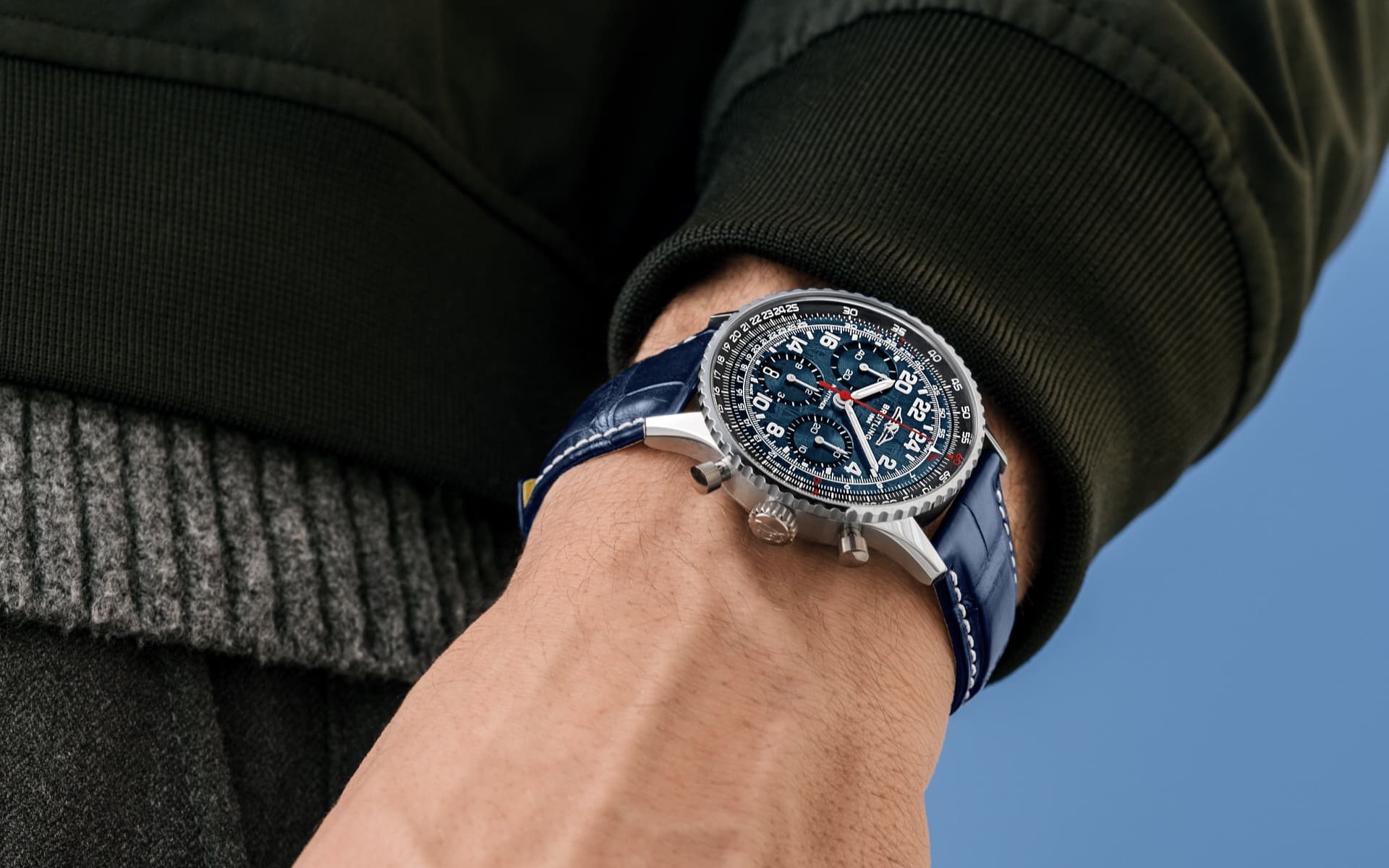 Technisch bleibt die Uhr ihrer Linie treu: Als 24-Stunden-Chronograph basiert sie auf dem handaufgezogenen Manufakturkaliber B02 und bietet die für die Navitimer typischen Funktionen wie den kreisförmigen Rechenschieber und die Chronographenanzeigen. Das 41 Millimeter große Gehäuse wird durch ein blaues Alligatorlederband ergänzt.