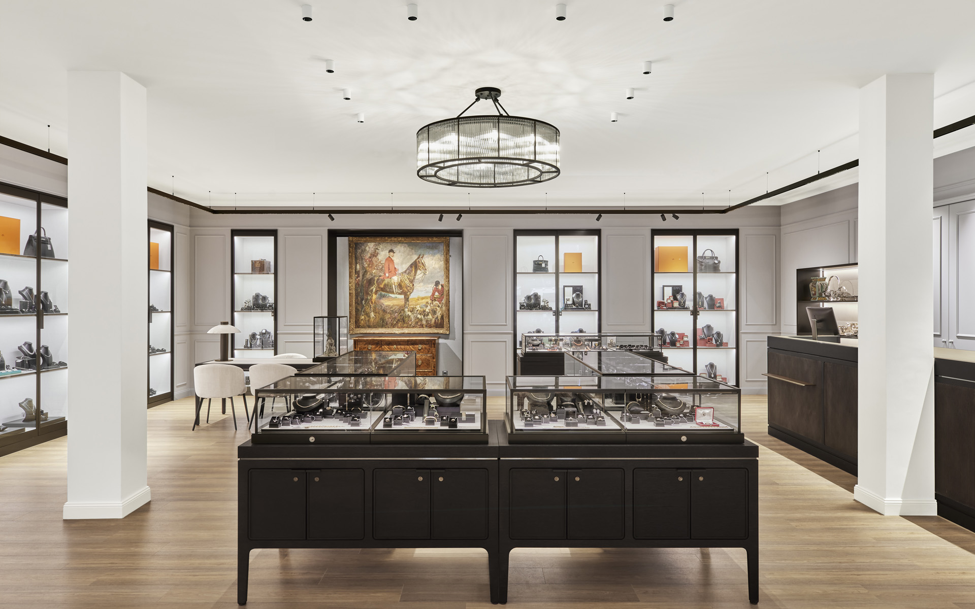Damit die Ware aber auch wirklich im allerbesten Licht glänzt, beauftragte Eppli den Spezialisten MüllerKälber mit der Inszenierung, sprich: dem Schaufenster und sämtlichen Vitrinen, einschließlich deren Beleuchtung. Das Projekt und die Herausforderungen, erinnert sich Holger Müller, wuchsen ebenso wie am Ende die Gewissheit, das Beste realisiert zu haben. Aber das Beste – das musste sich Holger Müller eingestehen – erreicht er nicht beim Ladenbau: „Wie könnte ich mit Größen wie Blocher Partners in Innenarchitektur, Design oder Projektmanagement mithalten? Meine Stärke liegt in der Präsentation von Luxusprodukten“, sagt Holger Müller.