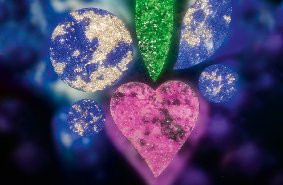 Raue, glitzernde Oberflächen und Farben, die einem ins Auge springen: Die Schmucksteine mit kristallinen Oberflächen aus dem Portfolio der Edelsteinschleiferei haben Charakter. Zum Angebot gehören viele freie wie klassische Formen in diversen Steinarten. Der Lapislazuli lebt vom Komplementär-Kontrast durch Pyrit-Gestein, der Kobaltcalcit von unterschiedlich feinen Kristall-Strukturen in Rosé und Pink. Beim Uwarowit, bestehend aus grünen Granaten auf schwarzem Muttergestein, deutet der kräftige Grünton auf einen hohen Chromgehalt hin.
