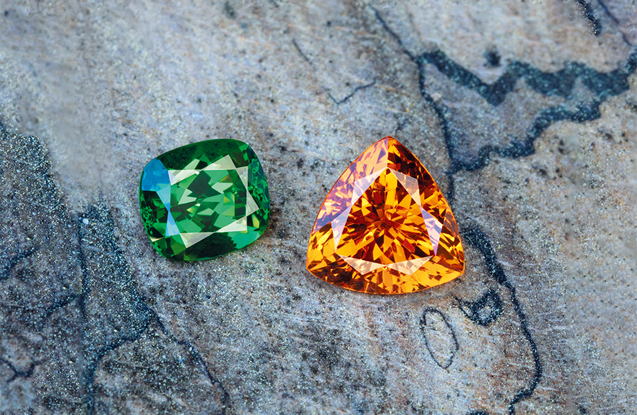 Isaline Arnoldi hat diesen Tsavorit und Mandarin Granat auf einem Fels in Szene gesetzt – als Referenz für das Angebot von Gemhype.com.