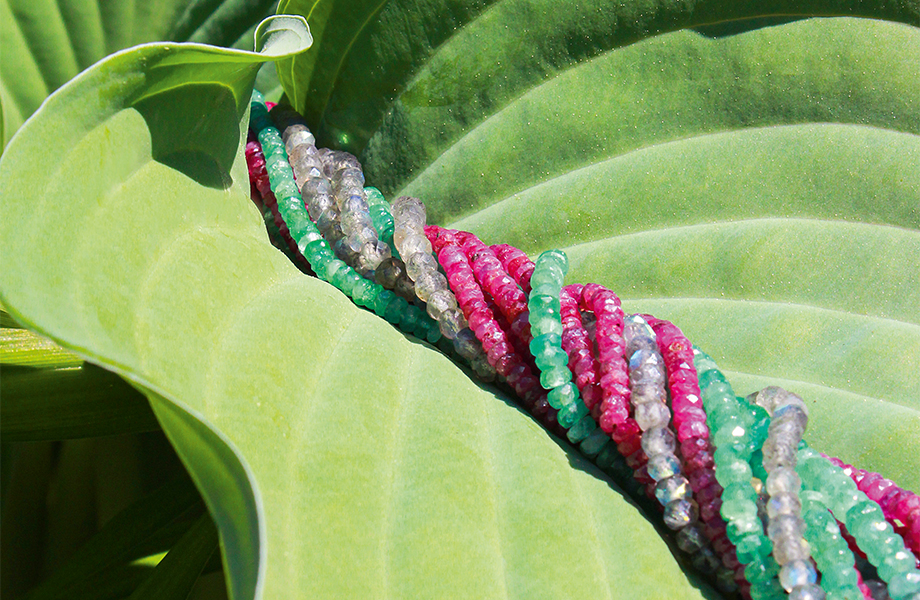 Die Gründerin der jungen Marke Hempeline hat sich mit ihren Lieblingsketten auf das Kreativ-Experiment eingelassen. „Es war für mich zunächst ungewohnt, den Schmuck in der Natur zu fotografieren, hat dann aber richtig Spaß gemacht“, erzählt die Fränkin, die mit ihrer Familie in der Nähe von Nürnberg wohnt, „in einer schönen Umgebung mit alten Häusern und Sandsteinmauern.“ Für das Foto in ihrem Garten hat sie drei Edelsteinketten aus Rubin, Labradorit und Smaragd zu einem Collier zusammengedreht. Danach ging sie auf die Suche nach einem geeigneten Naturelement für ein harmonisches Ergebnis. Die Lösung: das Blatt einer Funkie, stabil genug und von der Struktur her passend. Auch bei den Produkten ihres Labels ist Miriam Hempel der Einklang mit der Natur wichtig, genauso wie gute Bedingungen für die Menschen, die am Produktionsprozess teilhaben. Die Edelsteinketten trägt die junge Unternehmerin selbst gerne, am liebsten in Kombination mit ihrem Perlenschmuck.