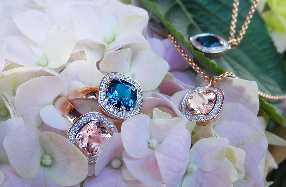 Die Inhaberin der Agentur Creativwerbe dachte bei diesen Ringen und Anhängern ihres Kunden Wilh. Müller aus 585 Roségold auf Anhieb an die roséfarbenen Hortensien in ihrem Garten. „Mit den zarten Blüten kommen die Morganite und die kontraststarken ‚Londonblue‘-Blautopase optimal zur Geltung“. Katharina Himmelhan – hier mit Agenturhund „Sepp“ – betreut das Schwäbisch Gmünder Unternehmen Wilh. Müller schon lange im Marketing, ist von Haus aus Modedesignerin und sagt von sich, sie sei „ein absoluter Naturmensch“. Aus ihrer Sicht haben alle Jahreszeiten ihren eigenen Reiz. Dem Frühjahr aber spricht sie einen besonderen Stellenwert zu: „Wenn die Blütenpracht nach der Ruhe des Winters Einzug hält, nimmt das Leben wieder Fahrt auf“.