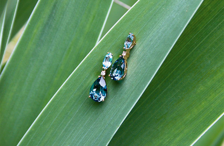 Die GZ-Aktion kam dem Team der florentinischen Schmuckmarke Ponte Vecchio wie gerufen. „Das passt gut für unsere neue Linie ‚Iris‘, die Bezug nimmt auf die gleichnamige Pflanze und auf unsere Heimatstadt“, meint Marketingmanagerin Laura Herd-Smith. Die beliebte Iris, deren botanischer Name auf die griechische Göttin des Regenbogens zurückgeht, wird auch als Schwertlilie bezeichnet. Sie ist das Symbol von Florenz und ziert als „Florentiner Lilie“ das Wappen der toskanischen Hauptstadt. Die Schmuckmarke Ponte Vecchio, benannt nach der weltberühmten Brücke, wo ihre Geschichte begann, hat der symbolstarken Blume eine ganze Kollektion gewidmet. Im Mittelpunkt stehen Edelsteine in den Farben ihrer natürlichen Vorbilder: „Londonblue“-Topas und „Sky“-Topas, Citrin, Amethyst und Granat. Fürs Naturmotiv wählte die Fotografin Ohrhänger in Blautönen, als Untergrund die Blätter einer Iris-Gruppe in den Hügeln der Toskana.