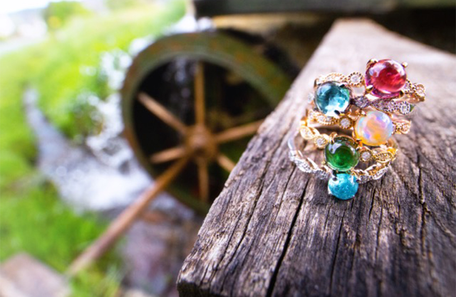 Sonst nutzt die begeisterte Fotografin für Produktbilder ihre Studioausrüstung im Familienunternehmen Richard Hans Becker. Diesmal hat sie sich von einer idyllischen Kulisse in ihrem Wohnort Allenbach bei Idar-Oberstein inspirieren lassen. Dass das Wasserrad am Hohlbach eine Miniatur-Ausgabe ist, erkennt man erst bei näherem Hinsehen. Ein Achatschleifer und Nachbar der Beckers hat es samt Häuschen gebaut. „Ich habe eine Umgebung gesucht, die den Bezug zu geschliffenen Edelsteinen herstellt“, sagt Birgit Becker, hier mit Levi, dem jüngsten Spross der Familie. Das richtige Licht für die neuen „Retro“-Ringe aus 750 Gold mit Cabochons vom roten Turmalin, Aquamarin, Opal, grünen Turmalin und Paraiba-Turmalin (v. o.) passte sie gegen Abend ab.