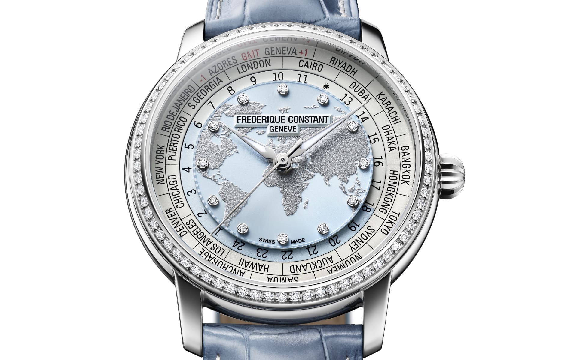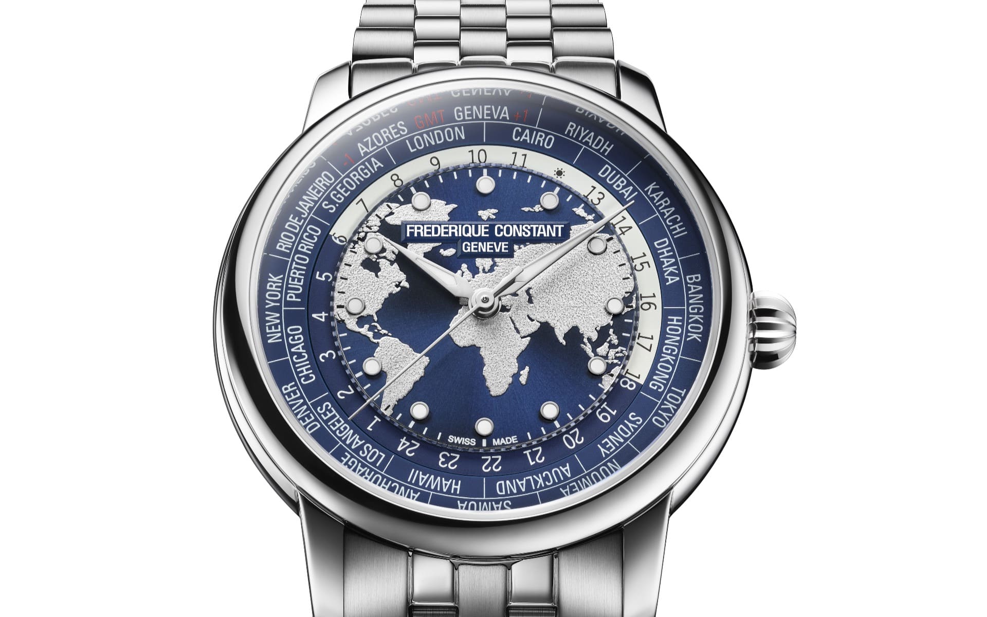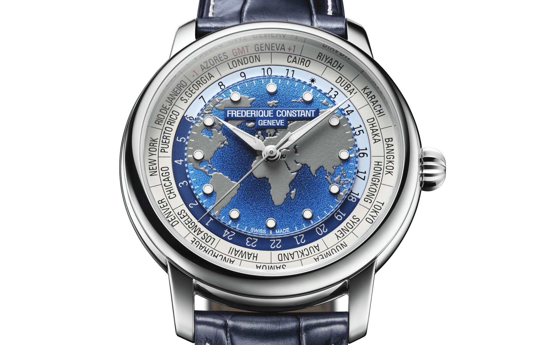 Gestalterisch präsentiert Frederique Constant drei Varianten: Zwei reguläre Modelle setzen auf neu gestaltete Zifferblätter mit plastisch ausgearbeiteten Kontinenten. Eine Version kombiniert dunkelblaue Ozeane mit grauen Landmassen und wird an einem neuen, fünfreihigen Edelstahlband getragen. Die zweite Variante zeigt ein blaues Farbverlaufs-Zifferblatt mit taupefarbenen Kontinenten und wird an einem austauschbaren Alligatorlederband geliefert.