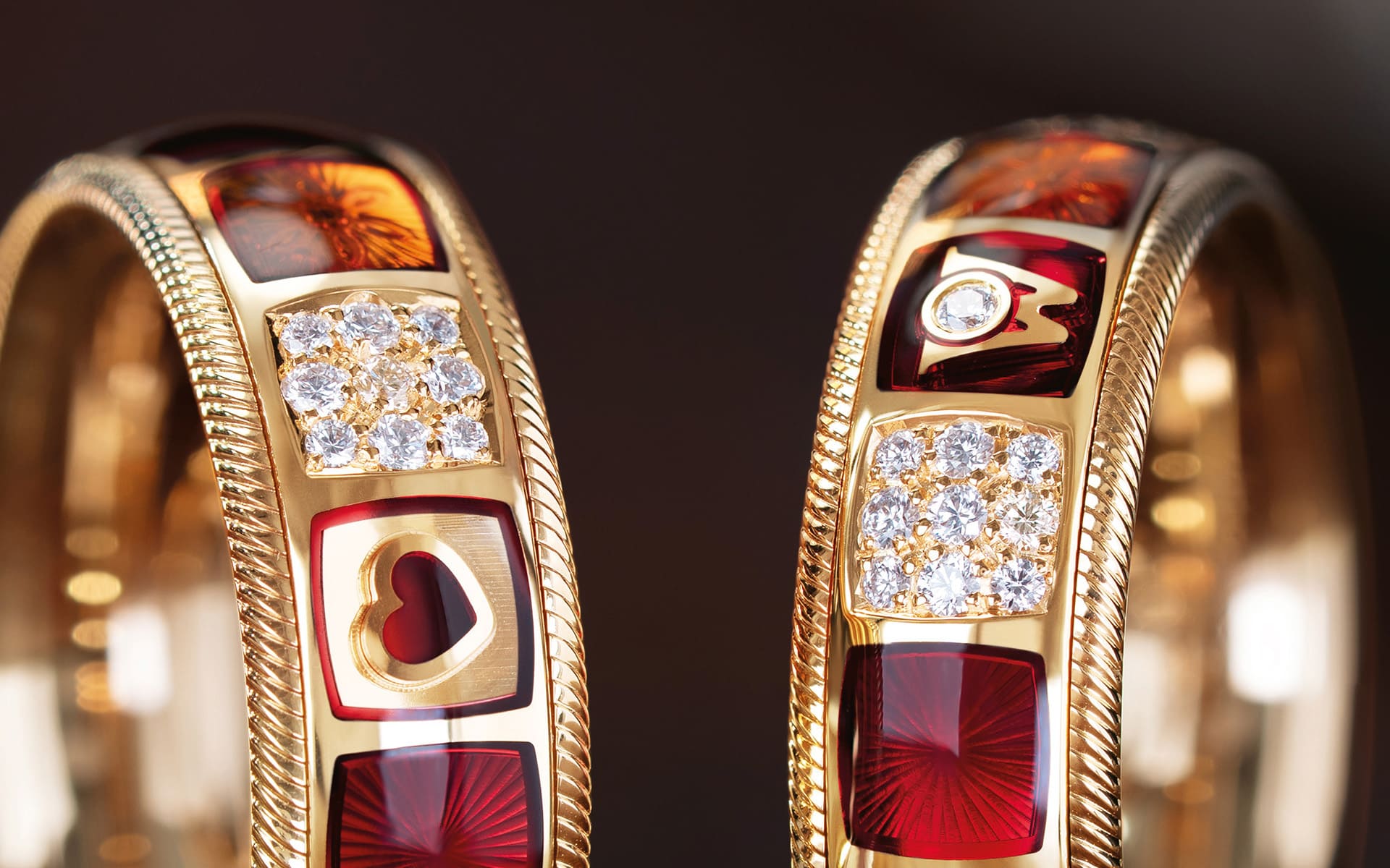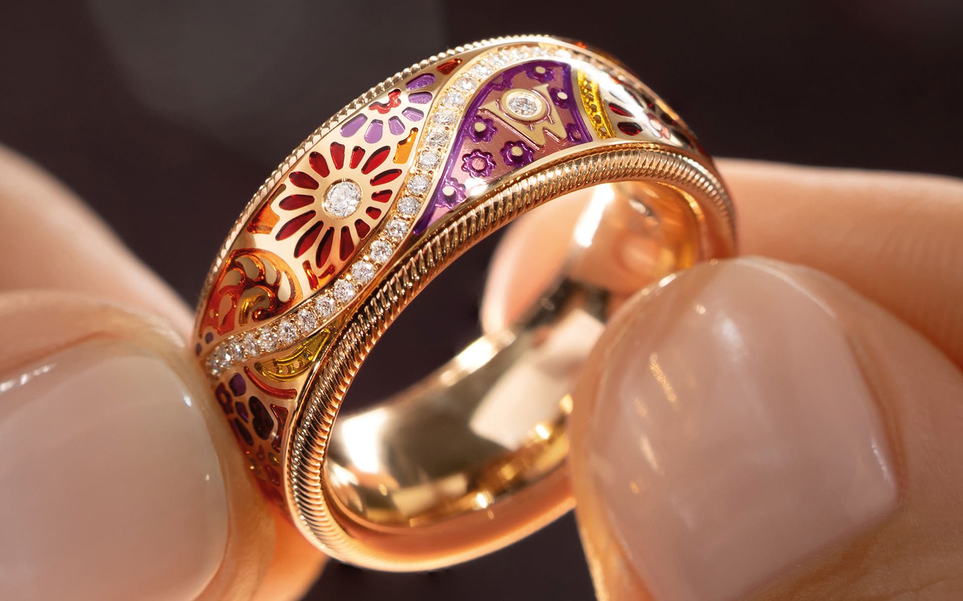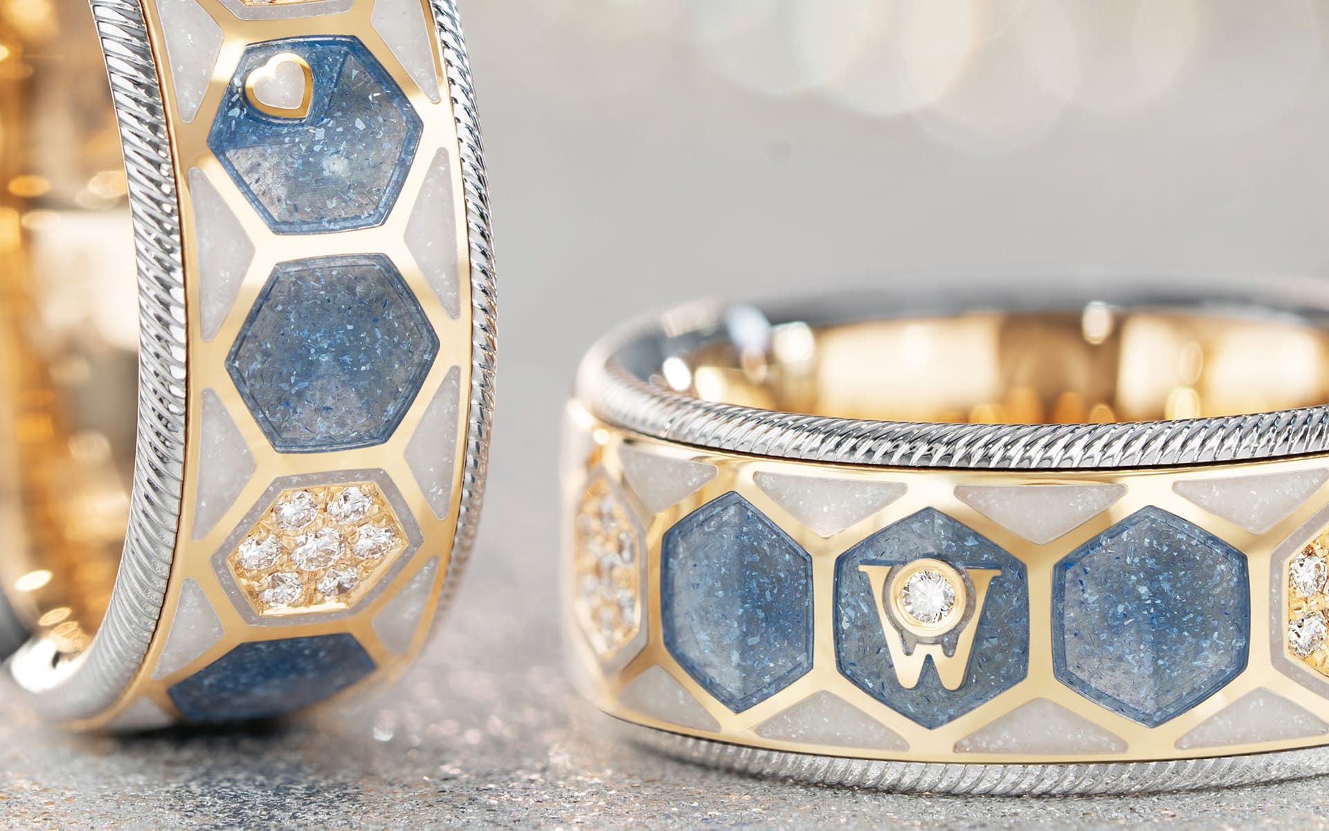 Emotional wird es mit „POWER OF LOVE“: Hier treffen gravierte Sonnenstrahlen und 46 Brillanten auf ein in Emaille eingebettetes Herz – ein verborgenes Detail, das wie eine intime Signatur wirkt. Der Ring „JEDER AUGENBLICK“ hingegen beeindruckt mit einem Sternenstaub-Effekt, erzeugt durch transparente und opake Kaltemaillefarben sowie feinste Kristallpartikel, die das Licht in unzähligen Facetten reflektieren.