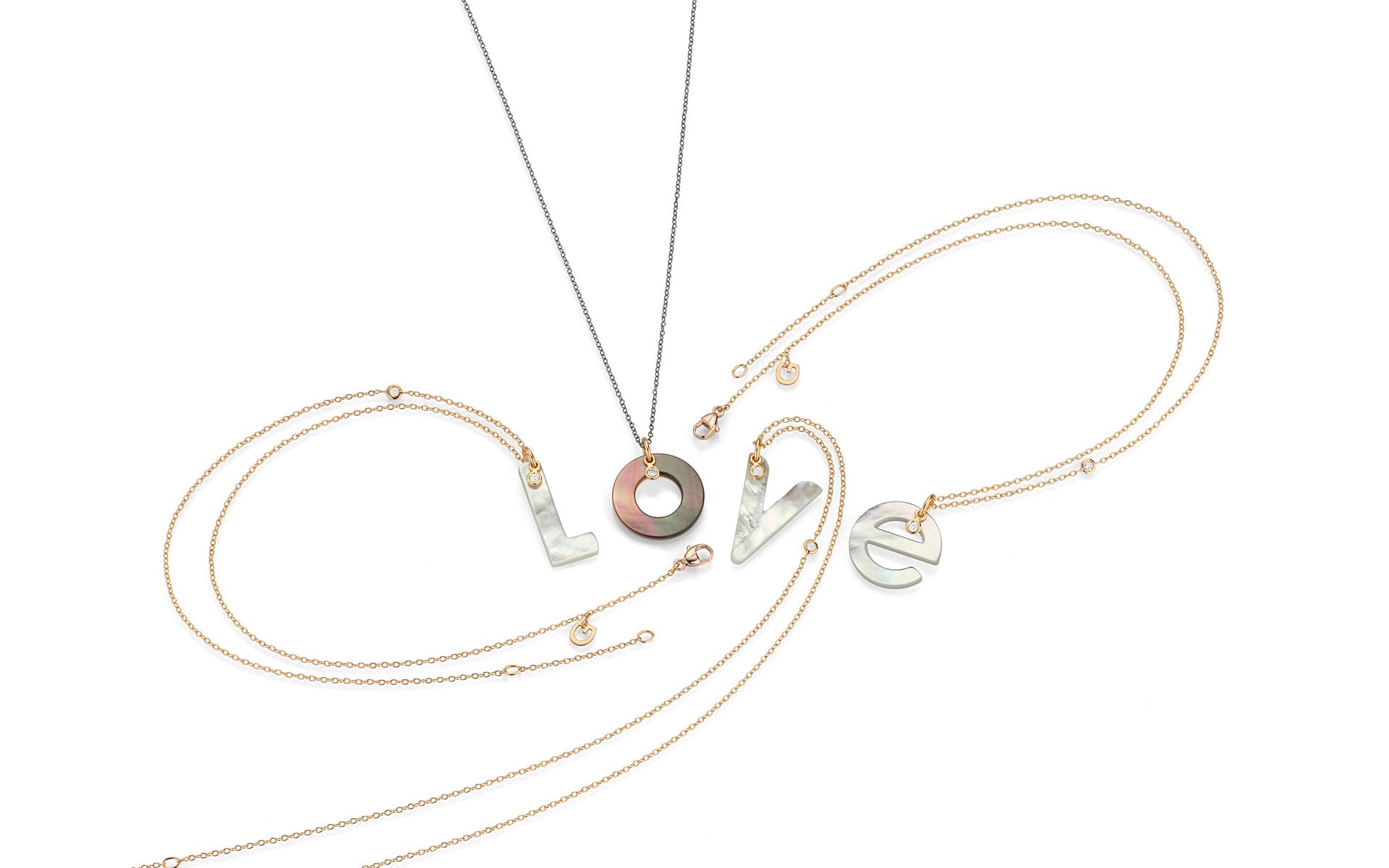 Zudem gibt es die beiden ABC-Varianten in „Bright“ und „Dark“. Der helle Perlmutt-Buchstabe wird mit einer Roségoldkette und einem zusätzlichen Diamantelement kombiniert und wirkt weich und feminin. Der dunkle Perlmutt-Buchstabe hängt an einer rhodinierten Silberkette und zeigt sich reduziert-modern.