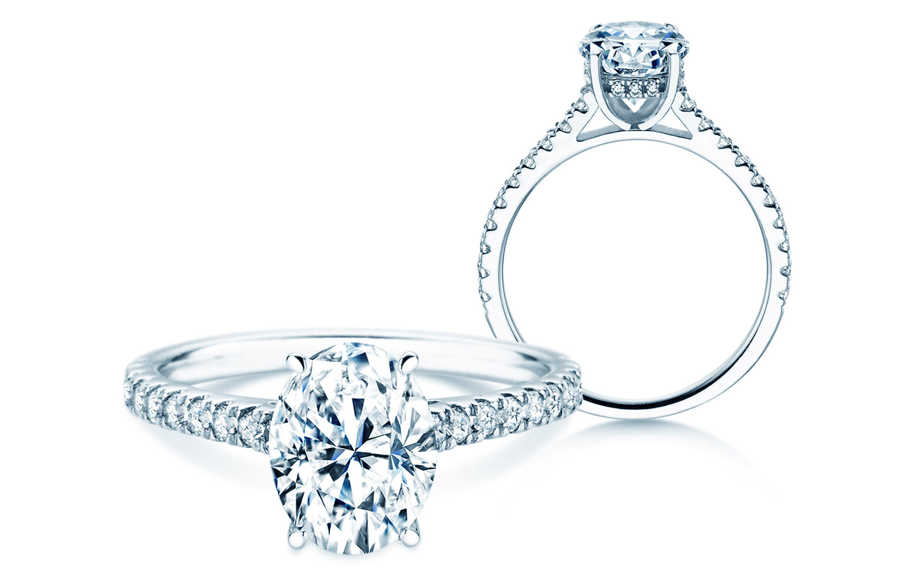 Im Zentrum steht ein oval geschliffener Diamant (G/SI) von sehr guter Schliffgüte, zertifiziert durch das renommierte GIA und garantiert konfliktfrei. Umrahmt wird der Hauptstein von 35 fein abgestimmten Brillanten, die dem Design zusätzliche Strahlkraft verleihen.