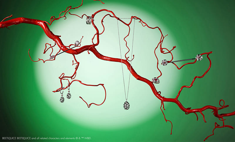 Die Kollektion besteht aus Ohrringen, Anhängern, Ringen sowie Accessoires wie Krawattennadeln aus 750 Weißgold, die von der Form einer Spirale inspiriert sind, einem Motiv, das in Tim Burtons Filmen häufig vorkommt, sowie von zwei Beetlejuice-Figuren: Headworm und Sandworm. Jedes Stück ist mit einem verantwortungsvoll geförderten Gemfields-Smaragd oder -Rubin versehen. Die feurigen, leuchtend roten Edelsteine dieser Kollektion wurden in der Montepuez Ruby Mining in Mosambik und die leuchtend grünen Smaragde in der Kagem Mining in Sambia abgebaut, die beide mehrheitlich im Besitz von Gemfields sind. Diese Edelsteine sind von Diamanten im Brillantschliff umgeben. Jedes Stück ist mit schwarzer, roter oder grüner UV-Emaille bemalt.