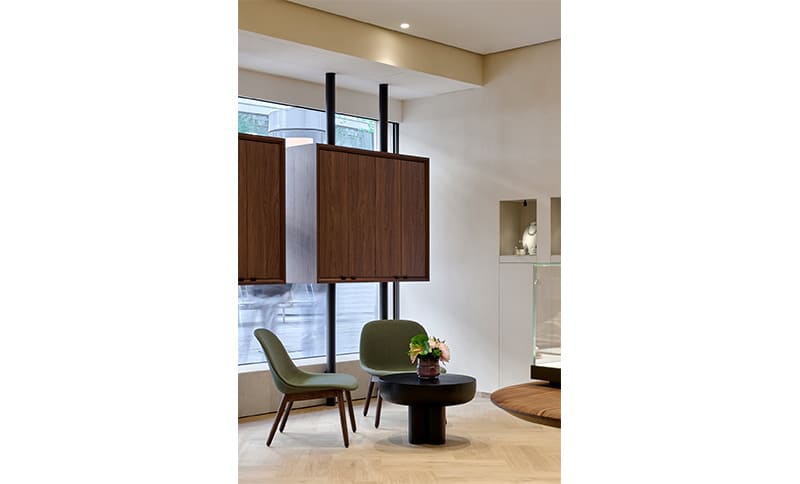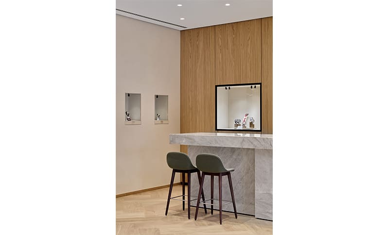 Das Herzstück im Eingangsbereich des neugestalteten Erdgeschosses bildet der Uhrmacher-Tresen mit Platz für zwei professionelle Uhrmacher, die ihre Handwerkskunst präsentieren und den Kunden als direkte Ansprechpartner beim Service von Uhren behilflich sind. Damit wird das Handwerk zelebriert und nochmals mehr an zentrale Stelle im Store gerückt. „Bei den hochwertigen Zeitmessern unserer Kunden ist es uns eine Herzensangelegenheit sicherzustellen, dass diese Generationen überdauern. Wir legen deshalb großen Wert auf unser Uhrmacher-Atelier, damit jedes Stück mit der gleichen Sorgfalt gepflegt wird, mit der es einst gefertigt wurde“, so Jochen Möhrle.