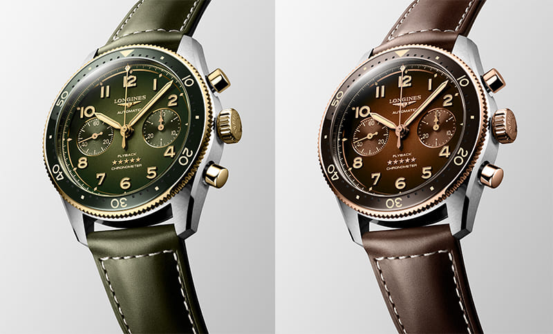Longines erweitert die „Spirit Flyback“-Linie um zwei neue Chronographen. Blickfang sind ein mattgrünes oder ein mattbraues Zifferblatt mit Dégradé-Effekt. Bei den zwei neuen Uhren sind einzelne Komponenten in Roségold (braune Version) beziehungsweise Gelbgold (grünes Modell) ausgeführt: Drücker, Krone sowie Indizes und Zeiger.