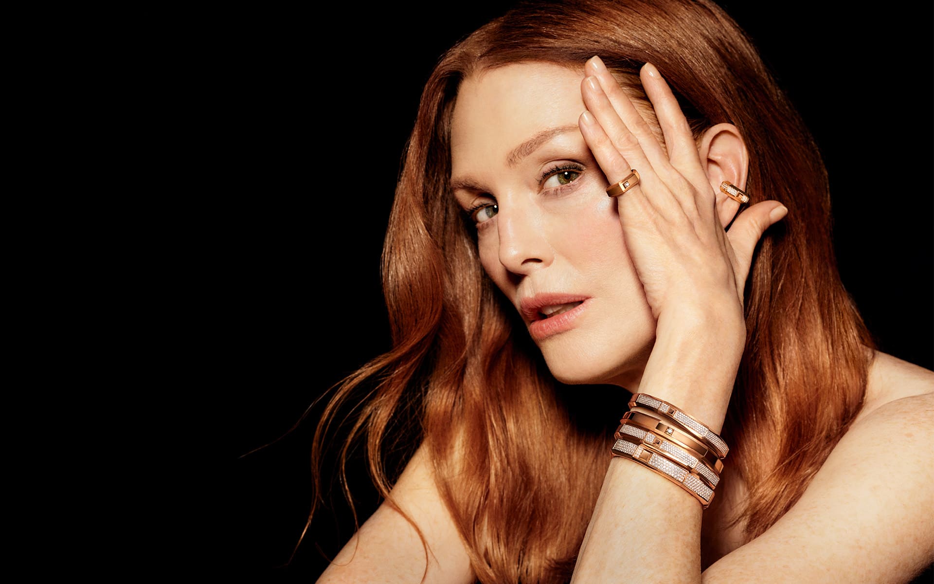 Julianne Moore bringt eine ruhige, reflektierte Tiefe in die Kampagne ein. Die Oscar-prämierte Schauspielerin verbindet emotionale Intensität mit natürlicher Eleganz. Ihre Sinn für Kunst, Architektur und Design harmoniert mit der Ästhetik der Kollektion, die mit klaren Linien, reduzierten Formen und einer fast architektonischen Präzision fasziniert.
