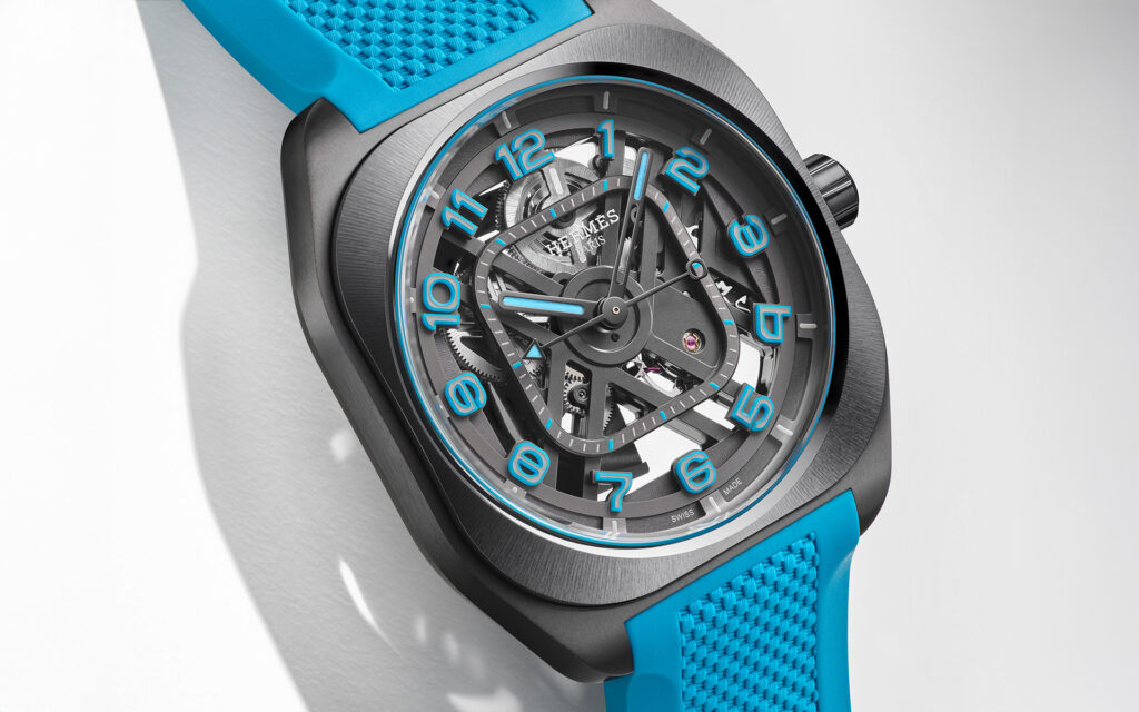 Zwei Details sind besonders bemerkenswert. Erstens: eine patentierte polarisierte Datumsanzeige bei 3 Uhr. Die Datumsscheibe ist so konstruiert, dass sie nur durch das dafür vorgesehene Fenster sichtbar ist, ohne die durchbrochene Architektur des Zifferblatts zu stören – eine elegante Lösung für ein Problem, das viele Skelettuhren ungelöst lassen: das Datum wirkt bei einem offenen Werk oft wie ein Fremdkörper. Zweitens: eine gebogene Gangreserveanzeige, die sich der Kurvengeometrie des Kalibers anschmiegt und die verbleibende Reserve auch während des Aufziehens intuitiv lesbar macht.