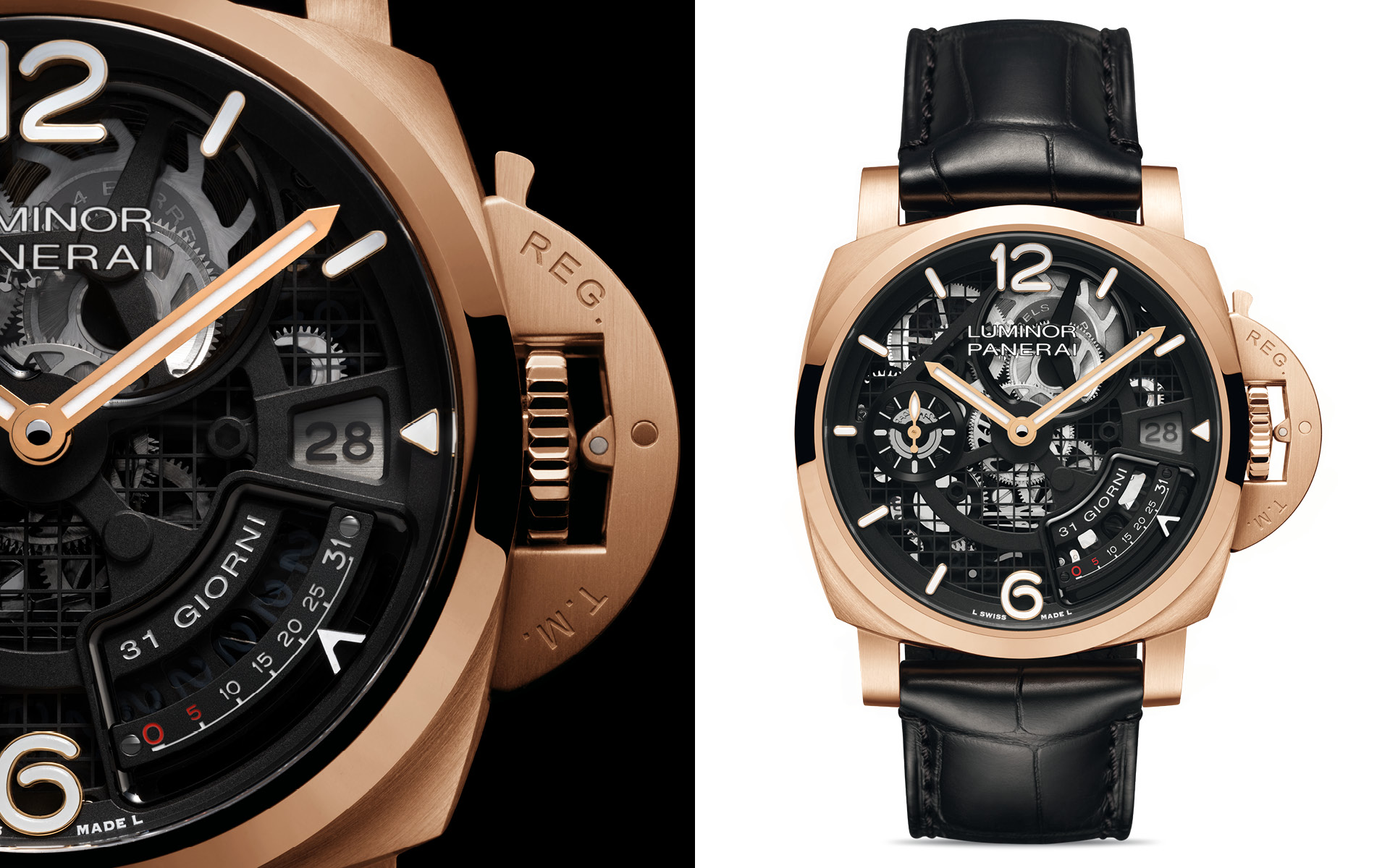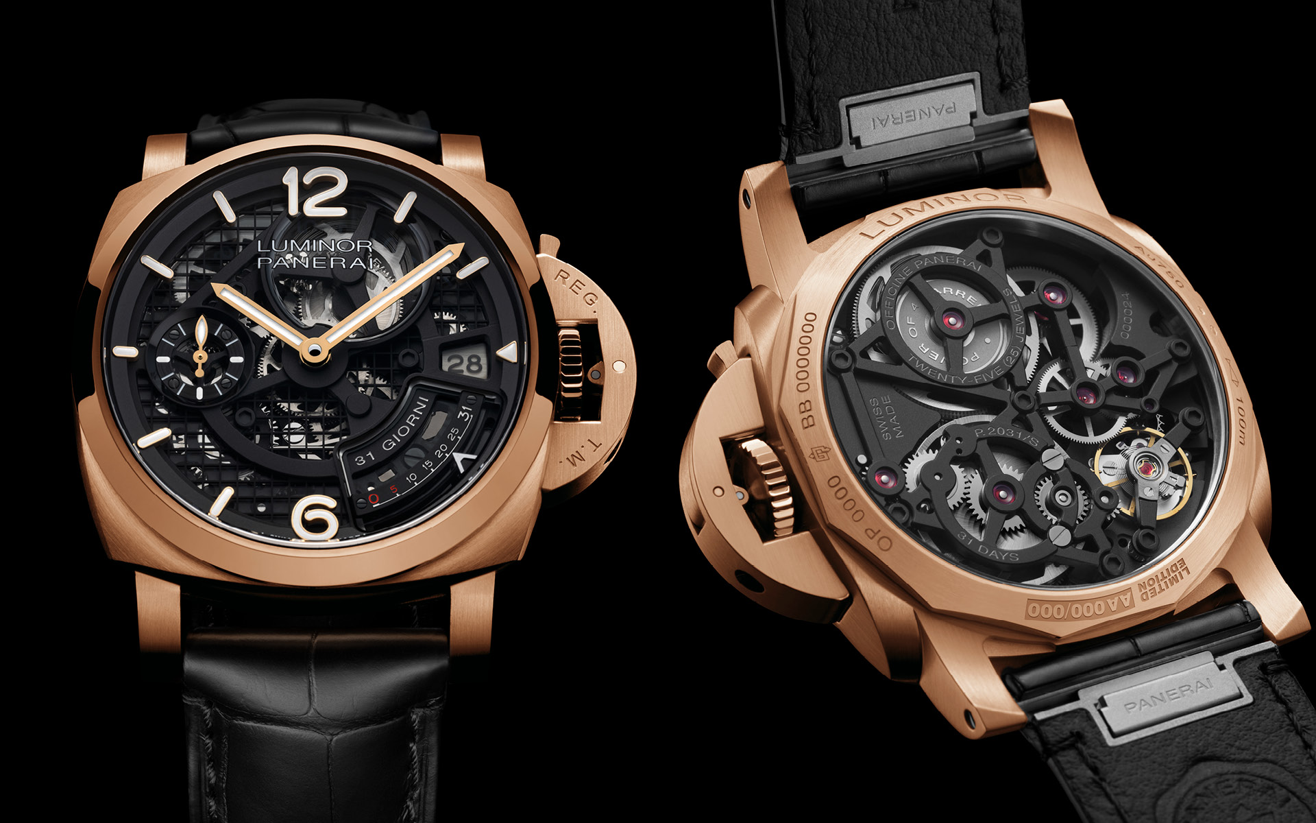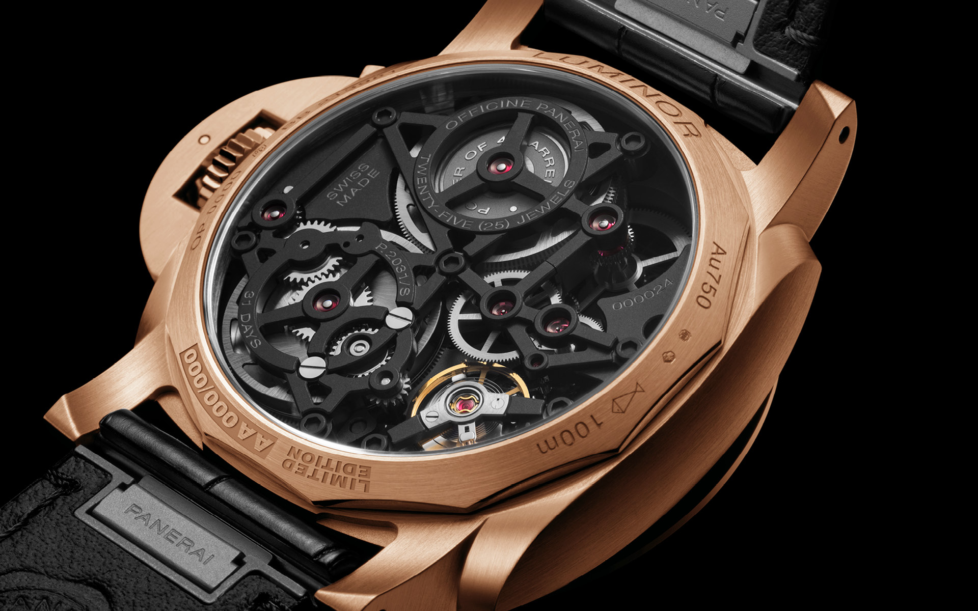 Das Kaliber P.2031/S zeigt sich vollständig offen – skelettiert – und macht das Werk zum eigentlichen Zifferblatt. Die vier Federhäuser sind von der Vorderseite aus sichtbar bei ungefähr 2 und 10 Uhr, die freigelegten Brücken und Räder erzeugen einen faszinierendem Schichteneffekt. Weißes Super-Luminova X2 auf den Stundenindizes und Zeigern mit goldenen Einfassungen sorgt für optimale Ablesbarkeit auch bei schlechtem Licht – klassische Panerai-Funktionalität.