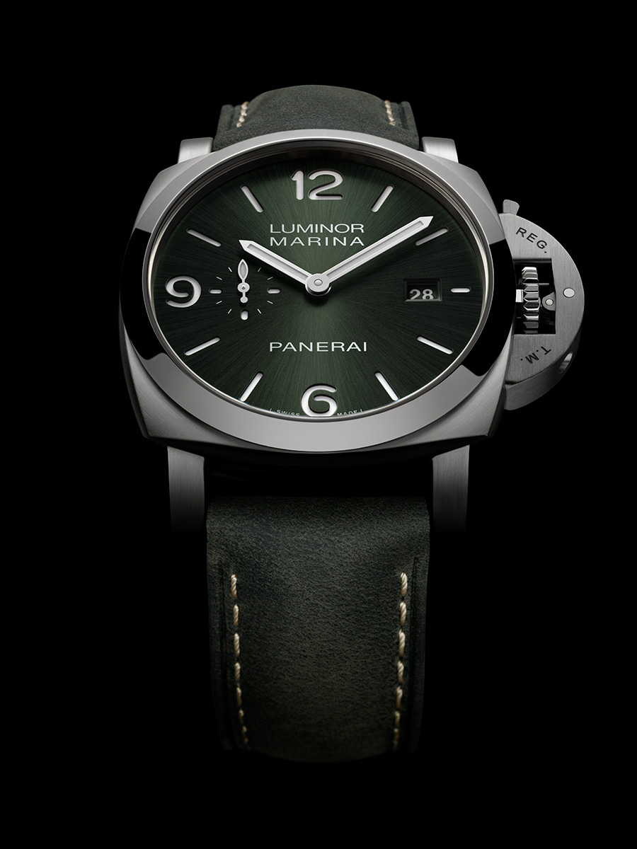Auch die klassischen „Luminor Marina“-Modelle bekommen Updates. So verwendet Panerai für das Modell „Luminor Marina Titanio“ PAM003325 hochwertiges Grade-5-Titan, das nach Angaben der italienischen Marke 44 Prozent leichter ist als Edelstahl und gleichzeitig korrosionsbeständig sowie äußerst robust. Das Material, gepaart mit einem olivgrünen Zifferblatt mit Sonnenschliff und einem dunklen Kalbslederband, erinnert an Panerais militärische Ursprünge und verleiht der Uhr eine markante Erscheinung.