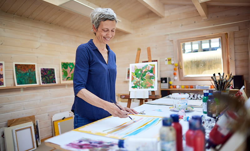 Eva Strepp, InhaberinIm Garten steht den Hang weiter hinauf ein Blockhaus – lichtdurchflutet dank eines großen Oberlichts und großer Fenster in Richtung Tal. Hier geht Eva Strepp ihrer Passion als Malerin nach, welche sie seit ihrem Studium pflegt. „Das ist für mich der Raum, um Kraft zu tanken. Es ist die freiere Seite von mir, denn hier kann ich ohne Druck meiner Fantasie freien Lauf lassen und etwas schaffen, ohne davon abhängig zu sein, es verkaufen zu müssen. Diese Freiheit befruchtet wiederum meine Arbeit als Goldschmiedin.“ Und auch bei ihren Bildern erkennt man ihre Philosophie, dass es immer eine klare Idee geben muss, die gut erkennbar ist. Formal haben die Gemälde trotz der floralen Themen eine gewisse Strenge, reduziert auf das Wesentliche. Hier schließt sich der Kreis zu ihrem Schmuck.