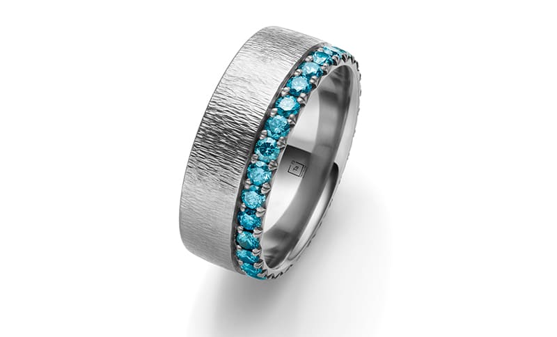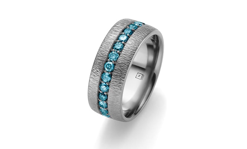 Ein Highlight ist natürlich der farbige Diamantbesatz, der in der eigens entwickelten Diamantalfassung gefasst ist. Diese weist innen eine Verschnittfassung auf. Bei den Diamanten stehen Farben wie Blau und Schwarz aber auch Rot, Gelb oder Grün zu Auswahl. Alle Diamanten stammen von der renommierten und in Pforzheim ansässigen Firma A. Gul KG Diamonds. Das Unternehmen wird von Inhaber Eitan Gul geleitet, seit 2020 arbeiten auch seine Söhne im Familienunternehmen mit. Für Eitan Gul ist beim Thema Diamanten für Männer „noch Luft nach oben“ – gerade im Bereich Männerschmuck und Partnerringe sei dies der Fall. „Das Konzept hinter dem Emoirering und sein Design ist ideal, um Männer dafür zu begeistern. Wir freuen uns, Tantalum Trauringe auf diesem Weg begleiten und mit unserer Diamantexpertise unterstützen zu können“, sagt Gul.