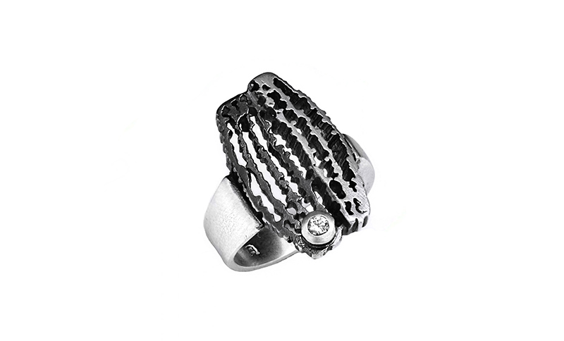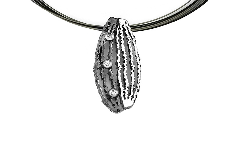 Das Zusammentreffen von geschwärztem und rhodiniertem Silber und weißem Saphir verleiht dem außergewöhnlichen Schmuckset einen reizvollen Kontrast und bringt die markanten Strukturen perfekt zur Geltung.